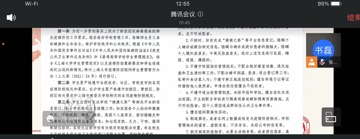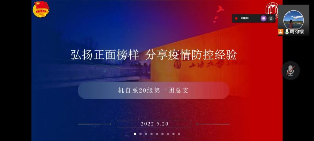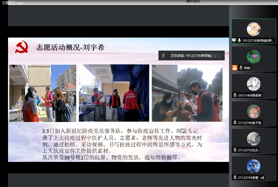 疫情防控期间学生管理暂行办法》相关要求,陈铭老师在学习中感谢2020级机设专业在新世纪男生13号楼、女生22号楼抗疫过程中发挥了“守楼有责”的榜样示范作用,同时也强调,当前全市已经进入社会面全面清零的攻坚阶段,越是稳中向好的关键当口,越要保持高度自律自觉。学习会上,陈老师邀请了李何瑞现身说法,代表机自系本科生第一党支部分享感人故事和抗疫志愿工作体会,3月2日以来,学生党员熊中毅等同志参与新世纪片区党员服务队,并充分调动楼内积极分子的工作积极性,共同维护好疫情期间楼内的学习备考。李何瑞同志报名上大后保部物资志愿服务工作,在零下20℃冷链空间搬运物资。刘宇希同志报名上大师生采访工作,用文字和镜头记录上大人的众志成城,勇敢向前的精神风貌。疫情以来,机自系校内外学生党员们驻守片区、维持核酸秩序,协助后勤搬运物资、参与防疫宣传、在小区内担任核酸志愿者……冲锋在前、争当表率,坚决把责任扛起来、把工作抓起来,团结带领广大入党积极分子和群众齐心协力,在班级群中释疑解惑、回应关切,持续引导班上同学自觉每日抗原+核酸“零报告”,主动增强自律意识,做好个人防护和寝室间相互监督。