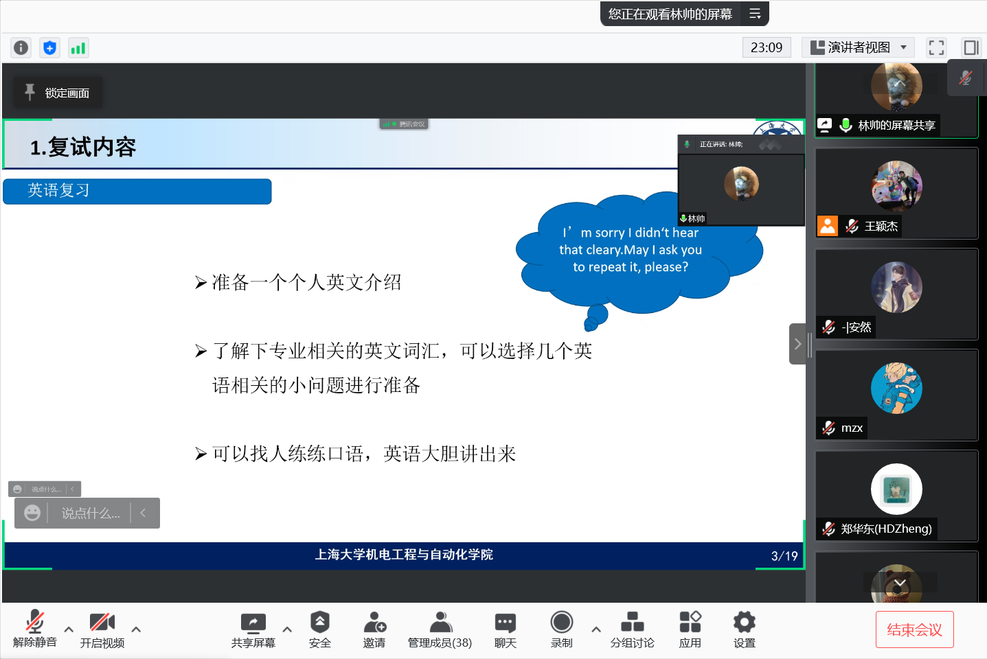 会议开始,王颖杰老师首先向同学们解读了当前复试的形势,并向大家介绍了复试的最新基本流程。然后,林帅同学结合自己在复试过程中的经历向同学们详细介绍了复试每个环节的具体过程和注意事项。紧接着,蒋琳雯同学针对复试过程中可能发生的各种情况以及如何合理应对进行了经验分享,并对学生们如何在最后几天进行冲刺准备做了指导。