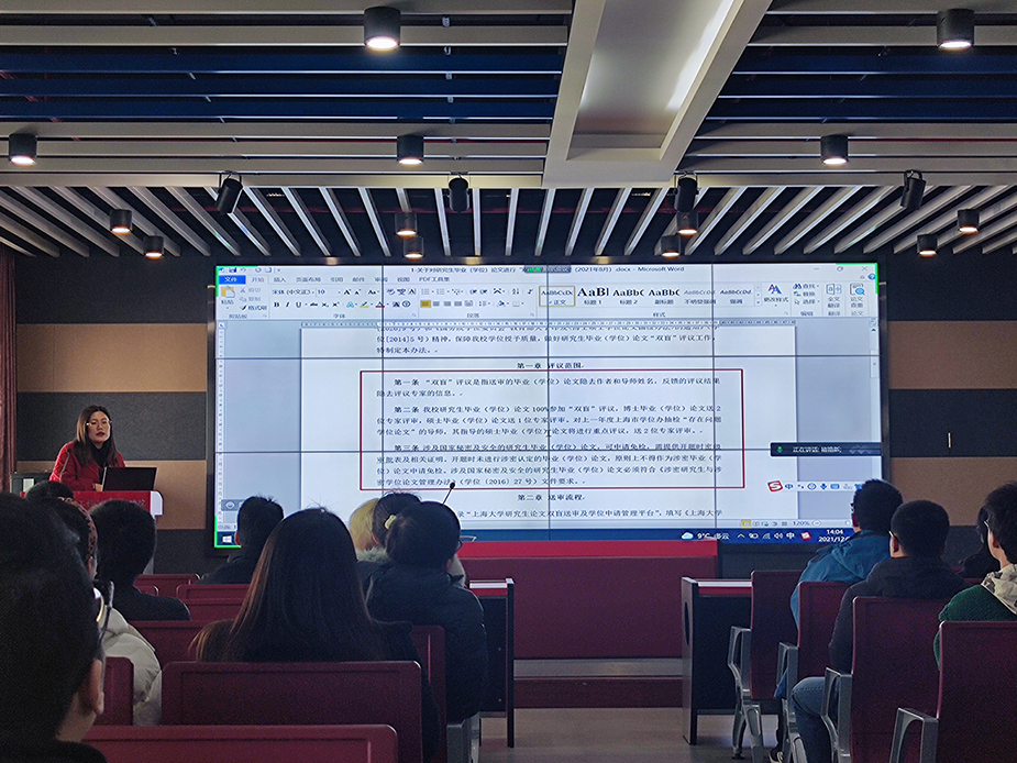 讲座伊始,褚老师根据研究生毕业(学位)论文进行“双盲”评议的规定,从盲审程序、盲评结果处理方式、学位论文抽检、研究生系统操作流程以及各环节注意事项进行了详细介绍,重点向同学们介绍了“双盲”评议的分数规则和相应处理办法,结合评议指标强调规范论文格式的重要性。同时,她从答辩程序、申请学位流程、申请学位材料明细、申请学位创新成果要求等方面对毕业答辩与学位申请流程进行了细致的讲解,并提供了自己制作的毕业指南手册,提醒相关材料的下载位置,方便同学们查阅和参考。