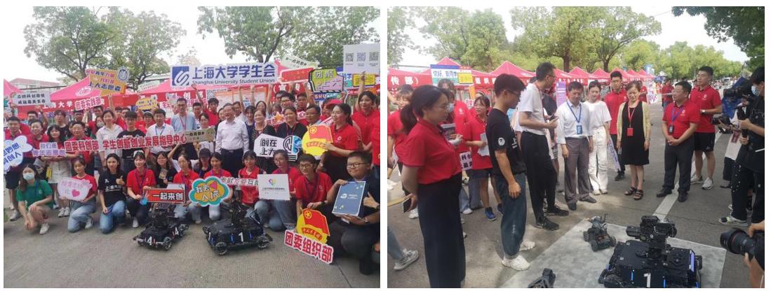 机自学院robomaster战队全程参与迎新展示工作。在带队教师黄慎之、陈勇的带领下,这些充满朝气、富有战斗力的青年学生科创团队为同学们介绍了智能车和robomaster机器人竞赛规则,以及所涉及的机械、控制、视觉等相关技术,并现场带来了精彩的机器人功能展示,吸引了大量新生驻足观看。科创团队的精彩展示得到了校党委书记成旦红、校长刘昌胜等校领导的肯定,随后校领导一行与同学们合影留念。