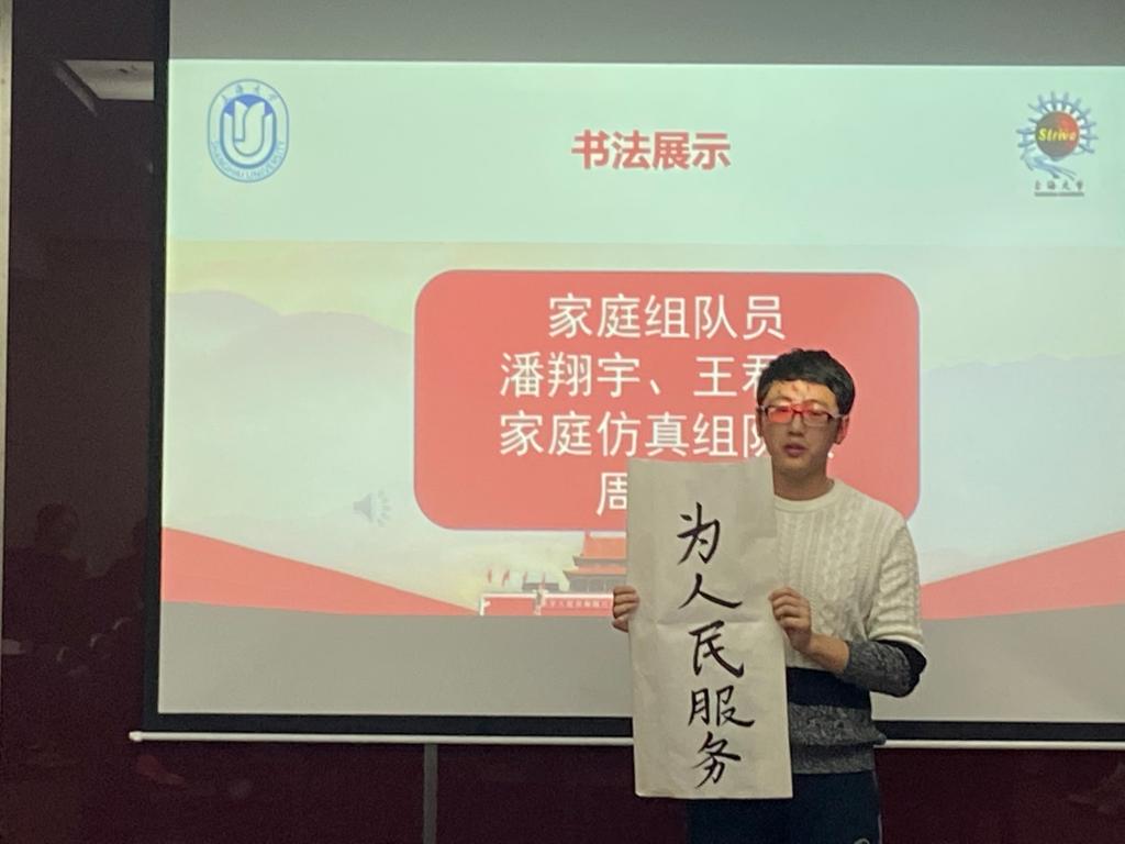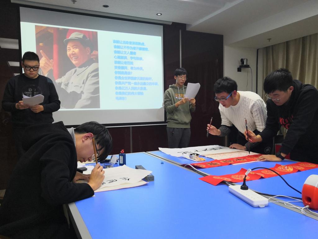 大三的潘翔宇同学写下了“西风落叶下长安,冷眼向洋看世界”的对联,寄语青年人尽管面前千难万险,仍“百舸争流”、“鹰击长空”。大三的王君豪同学写下了“恰同学少年,风华正茂;书生意气,挥斥方遒”,强调我们要向青年时代的毛主席看齐,充满朝气活力,彰显出蓬勃向上的奋进势头。大三的周承铭同学写下了“为人民服务”的宗旨,这是青年一代要永远践行的准则。