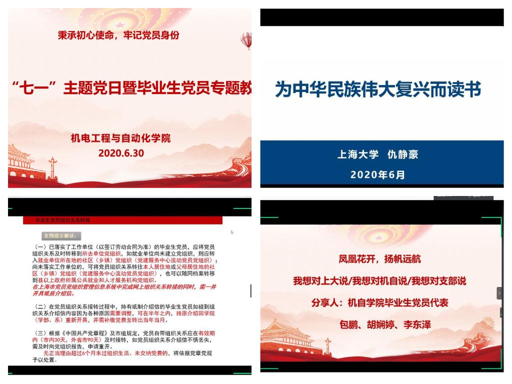 6月30日晚上6点,机自学院以“秉承初心使命,牢记党员身份”为主题的迎“七一”主题党日暨毕业生党员教育活动在腾讯会议平台顺利举行。学院党委书记于瀛洁、党委副书记仇静豪,组织干事谢姚、本科生辅导员以及全体本科生党员参与此次活动。