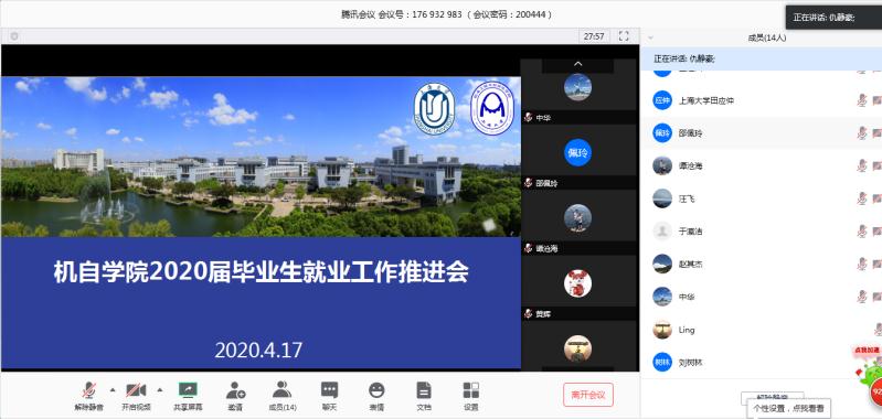 4月17日晚7点整,机自学院2020届毕业生就业工作推进会在腾讯会议平台召开。会议由学院党委副书记仇静豪主持,学院党委书记于瀛洁,自动化系党总支书记王灵、系主任苗中华,机自系党总支书记赵其杰、系主任田应仲,精机系系主任刘树林,电气系系主任汪飞,学院就业主管金建国和全体毕业班辅导员参加。
