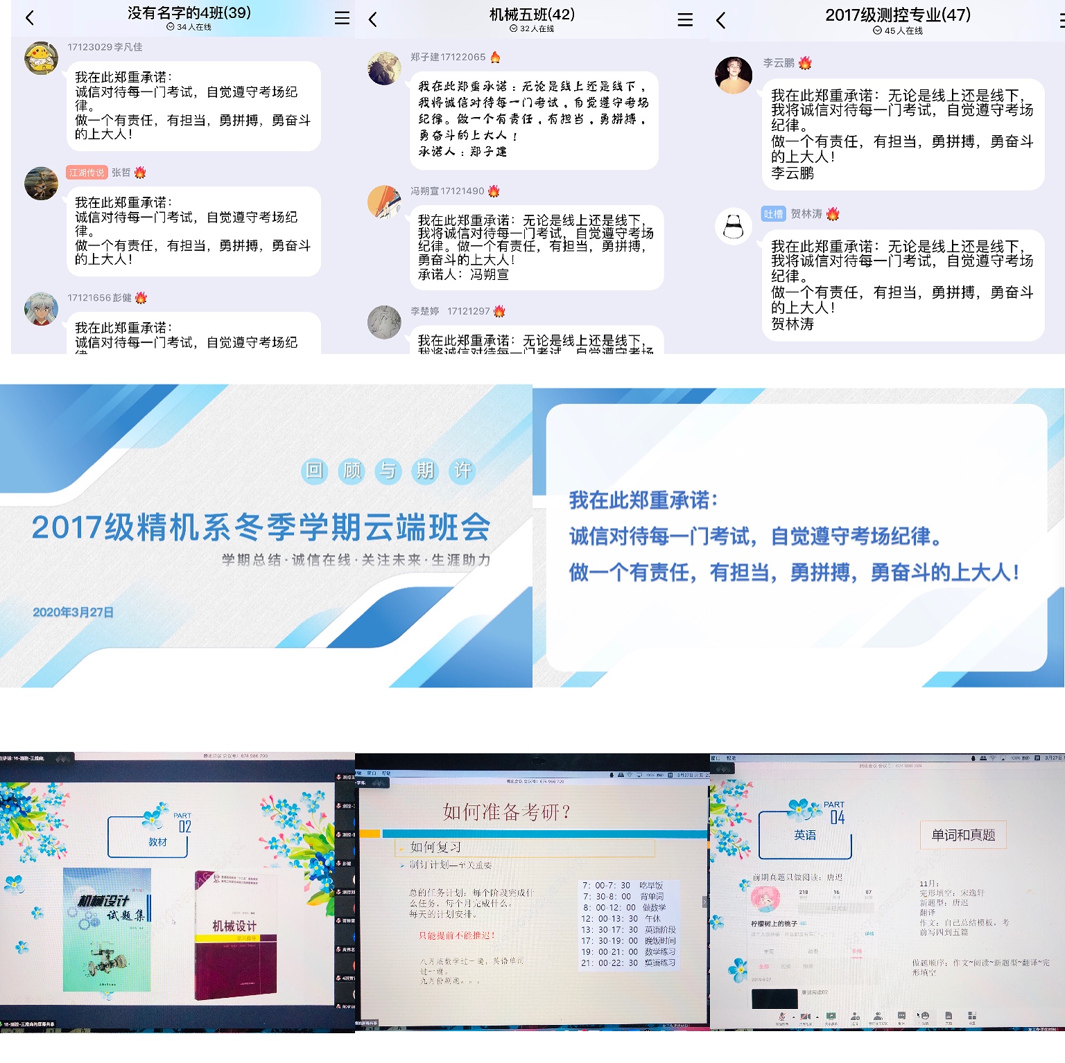 学生违纪处分规定》的相关内容,叮嘱大家要时刻规范自身行为,不能心存侥幸,要脚踏实地学好每一门课程。同学们也纷纷做出郑重承诺:无论是线上还是线下,将诚信对待每一门考试,自觉遵守考场纪律。做一个有责任,有担当,勇拼搏,勇奋斗的上大人!