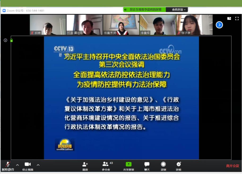 第三个环节是支部党员李晨辉向大家普及了疫情相关的法治知识,强调了几条重要的新冠病毒防治法律,并和大家一起观看了习近平全面提高依法防控依法治理能力的相关新闻报道。