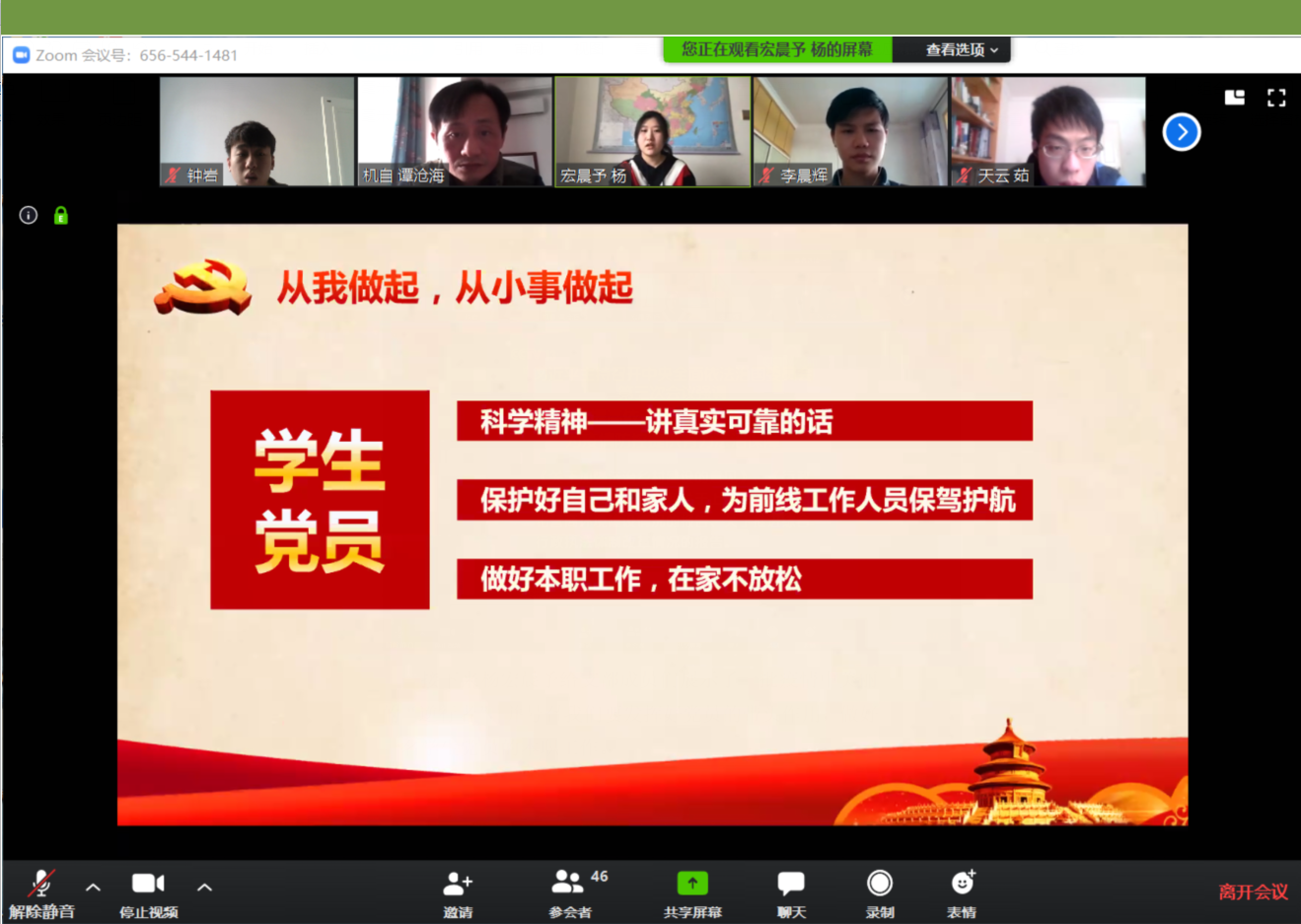 通过本次主题党日,我们在学习和讨论中达成以下共识:作为一名学生党员,我们要依法防控,科学防控,在家不忘提高党性修养和专业能力,做到防控学习两不误。相信在党和国家的领导下,战“疫”一定会取得胜利!