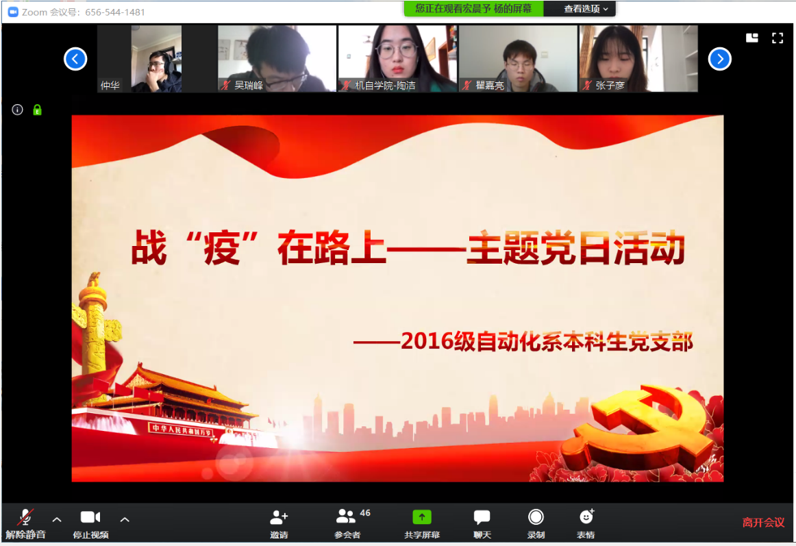 2020年2月23日,在抗疫的特殊时期,机自学院 16级自动化系本科生党支部利用Zoom网上视频会议系统组织开展了主题为“战疫在路上”的主题党日,下午两点,支部全体成员准时加入到会议中来。