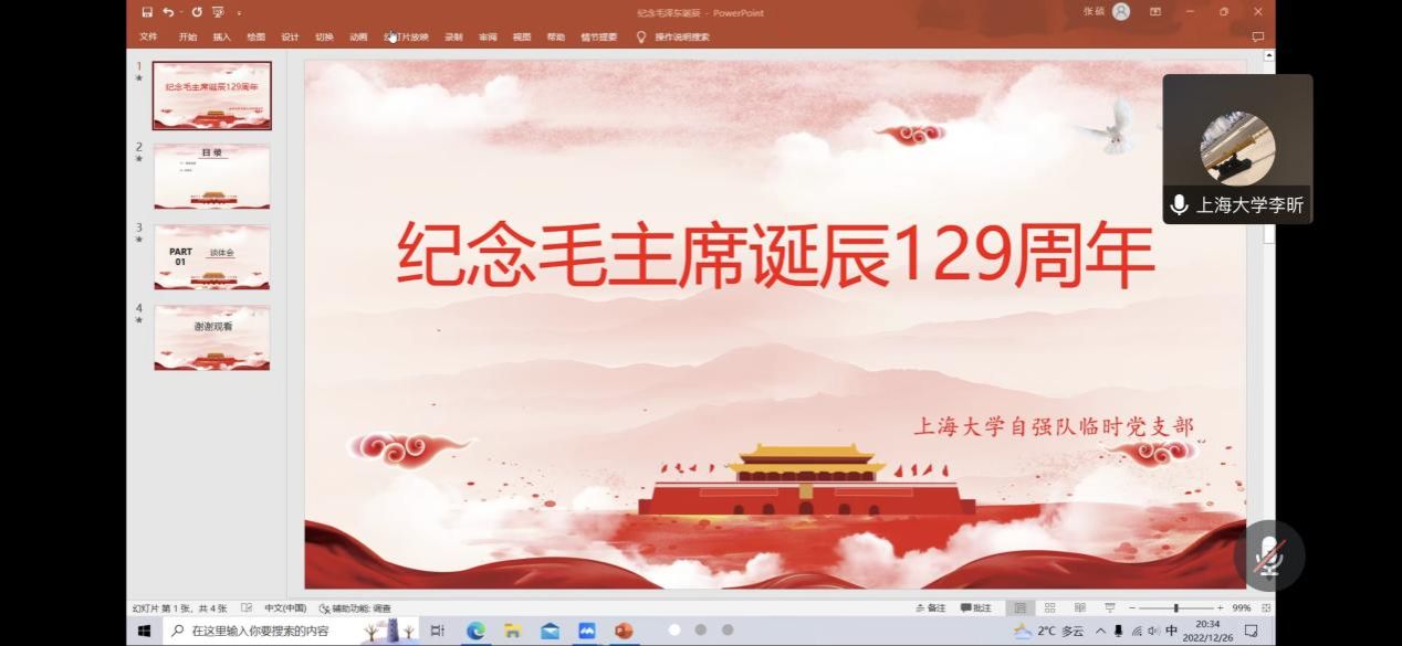 12月26日晚上八时半,机自学院自强队在指导老师王海宽等老师的关心指导下,线上开展了纪念毛泽东诞辰129周年纪念活动。参加本次活动的指导老师有李昕老师、黄慎之老师和荣誉指导陈万米老师,以及近十名研究生和两名本科生代表。本次纪念活动由自强队临时党支部负责人张硕主持。