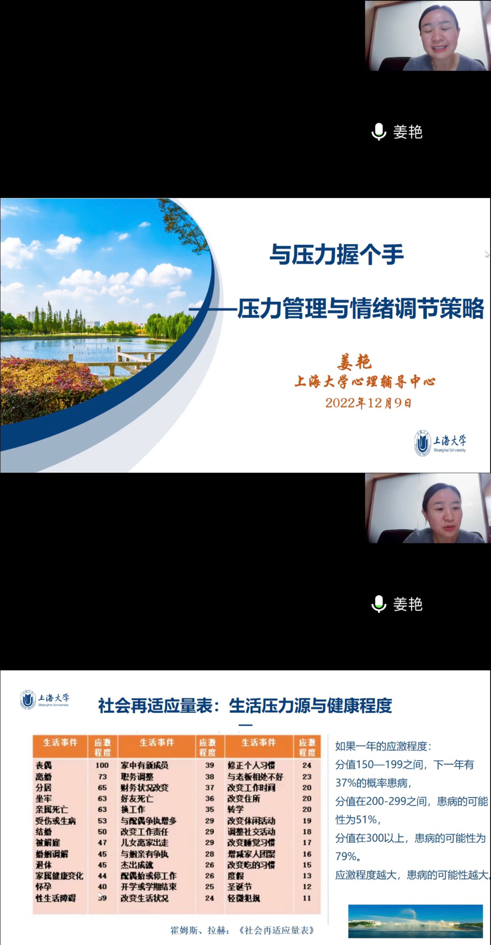 心理辅导中心姜艳老师,为22级两个直招班的同学进行了主题为《与压力握个手——压力管理与情绪调节策略》的线上讲座。
