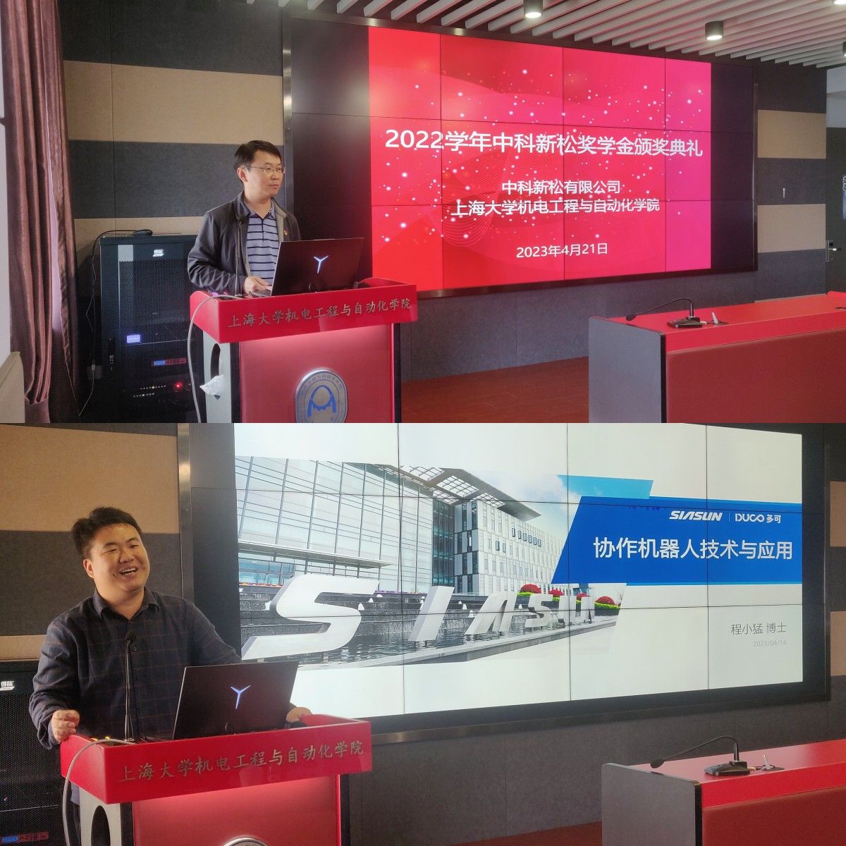4月21日下午,中科新松奖学金颁奖典礼暨机器人专题讲座活动在机自学院伯时会堂成功举办。中科新松有限公司研发中心副院长程小猛、投资与战略规划部副部长贾龙冲,机自学院党委副书记、副院长杨扬,机自系党总支书记赵其杰、副书记陈铭、副主任张健滔,以及本届获奖学生等共同出席仪式,自强书院本科生及机自学院研究生也踊跃参与讲座聆听。活动由机自系系主任田应仲主持。