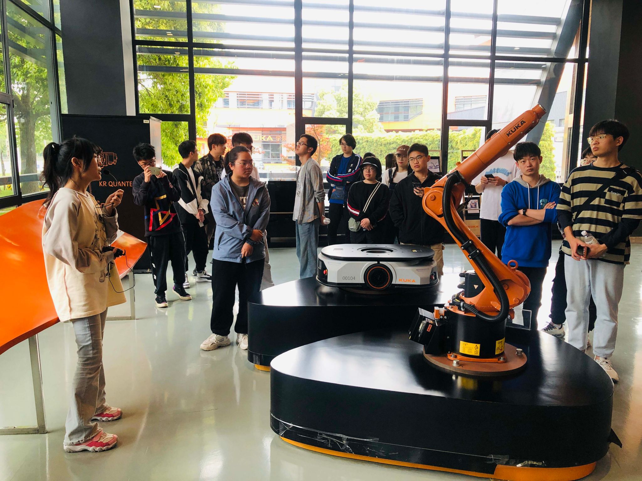 随后,大家又来到库卡机器人(上海)有限公司进行参观走访。在讲解人员的介绍下,同学们了解到库卡集团从1889年成立以来的关键年份事件与历史沿革,并参观了展厅中6台最为著名的六轴机器人。在生产车间区域,大家参观了机械臂从备料、清洗、组装、装配、测试到涂装的整个过程,还了解到机器人本体及核心零部件国产化的推进及进口替代正在加速,我国的工业机器人行业正进入一个快速赶超发展期。