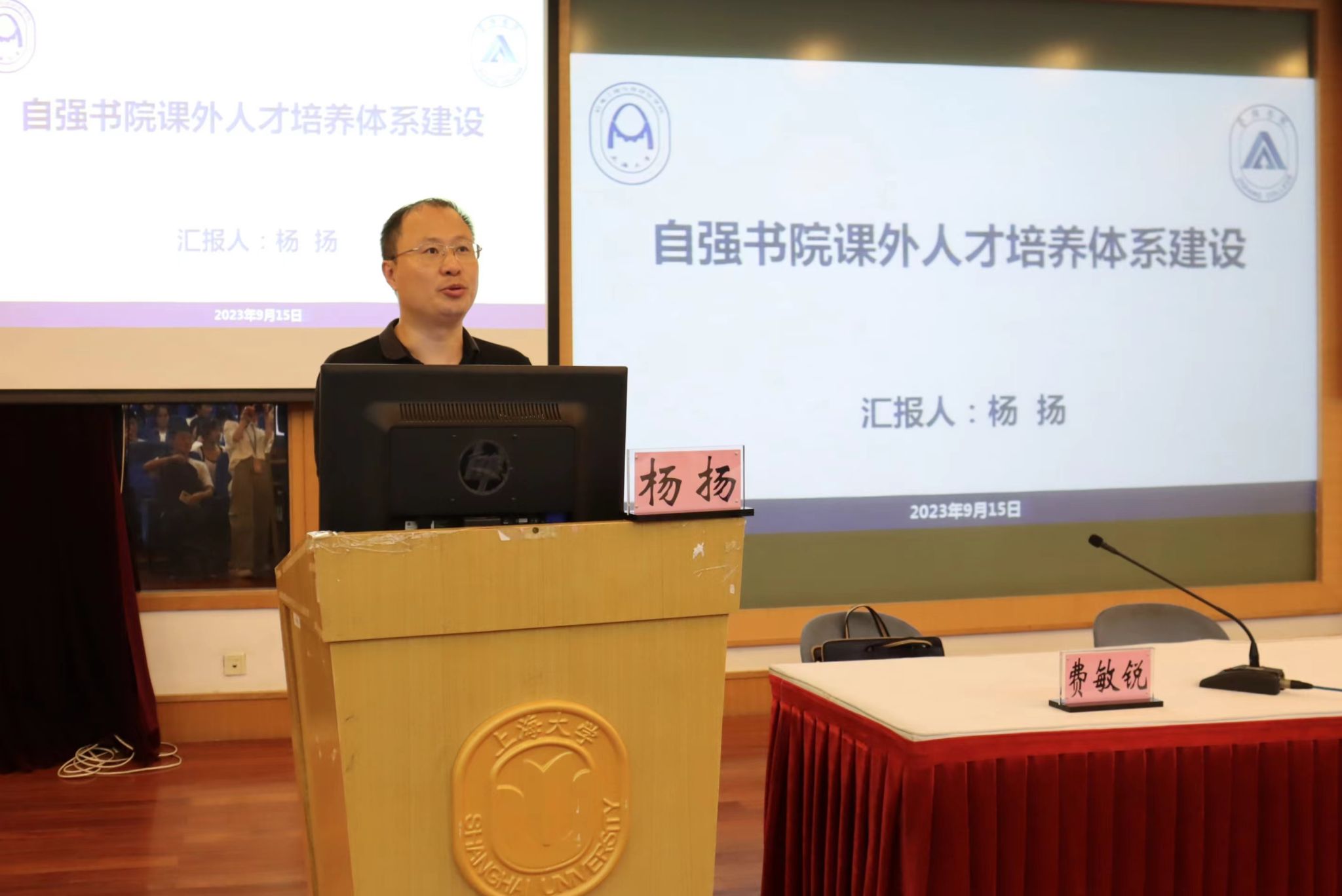 会议伊始,自强书院执行院长杨扬向大家介绍自强书院人才培养的建设情况。杨扬老师总体介绍了自强书院的人才培养目标和课外培养体系,展示了自强书院在本科学科竞赛、创新实践等方面取得的优异成绩。杨老师提出,作为工科生,要明确学习的目标和规划,在日常研究和学习的过程中,培养探索精神,勇于去闯无人区,践行上大校训“自强不息,道济天下”。
