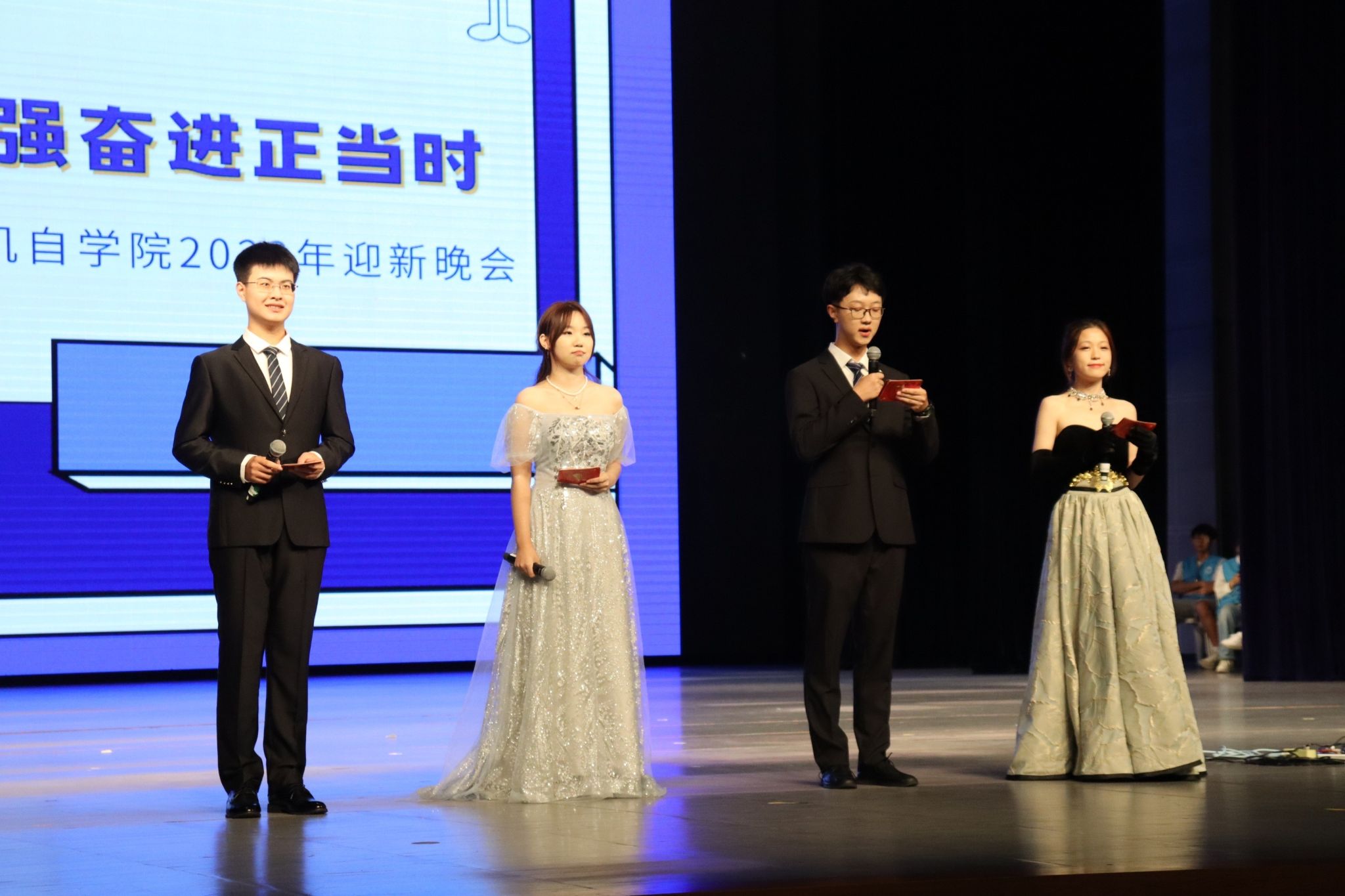 走过青春洋溢,乘风破浪,在迎新晚会的最后一个篇章中,叶宗羲同学带来的独唱《如愿》以悠扬的旋律和感人至深的歌词,打动了在场的每一位听众。随后,张阳同学为我们献上了一首经典之作《最长的电影》。之后由形体协会带来的舞蹈《Rumor》以独特的编排和精湛的舞技,展现了少女肆意又张扬的美,表现出最美的青春模样。晚会的大奖由自强书院院长费敏锐老师上台抽出并颁奖。最后,蓝昊良同学的独唱《稻香》将晚会的气氛推向最高潮,伴随着他的歌声,整场晚会温馨落幕。