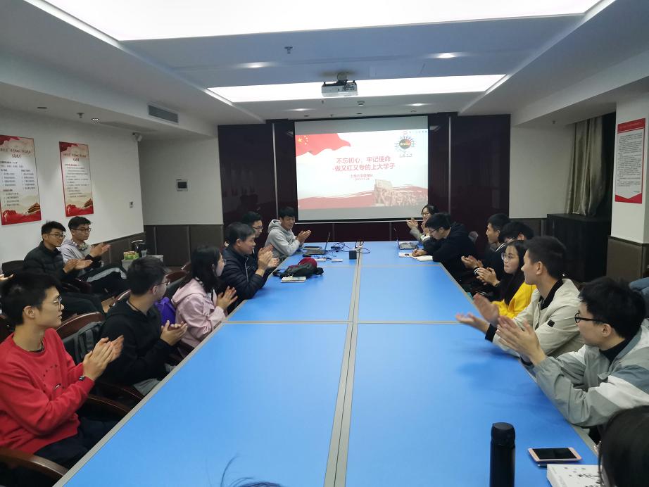 11月24日,即冬季学期首日教育日18:30,在宝山校区机自大楼604会议室迎来了自强队临时党支部的特色活动。本次活动将“不忘初心,牢记使命,做又红又专的上大学子”的主题贯彻始终,以弘扬民族精神与爱国情怀,加强爱国主义教育,并提升自强队队员的政治素养。参会人员有机自学院团委书记邱之卯,自强队指导教师陈万米、黄慎之以及自强队部分核心成员四十多人,活动由自强队临时党支部书记高洋主持。