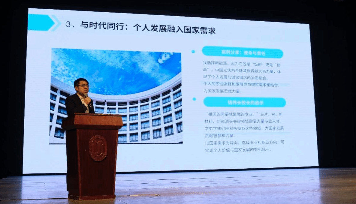 徐小勇校友以“把握时代脉搏,开启专业人生”为主题,分享了自己从工程师到企业高管的跨界转型经历,他强调了动手能力、综合能力和进取心的重要性,并提出了三条职业发展建议:夯实核心能力、做出正确选择、与时代同行。他鼓励同学们以国家需求为导向,将个人发展融入国家需求,实现个人价值与国家发展的有机统一。