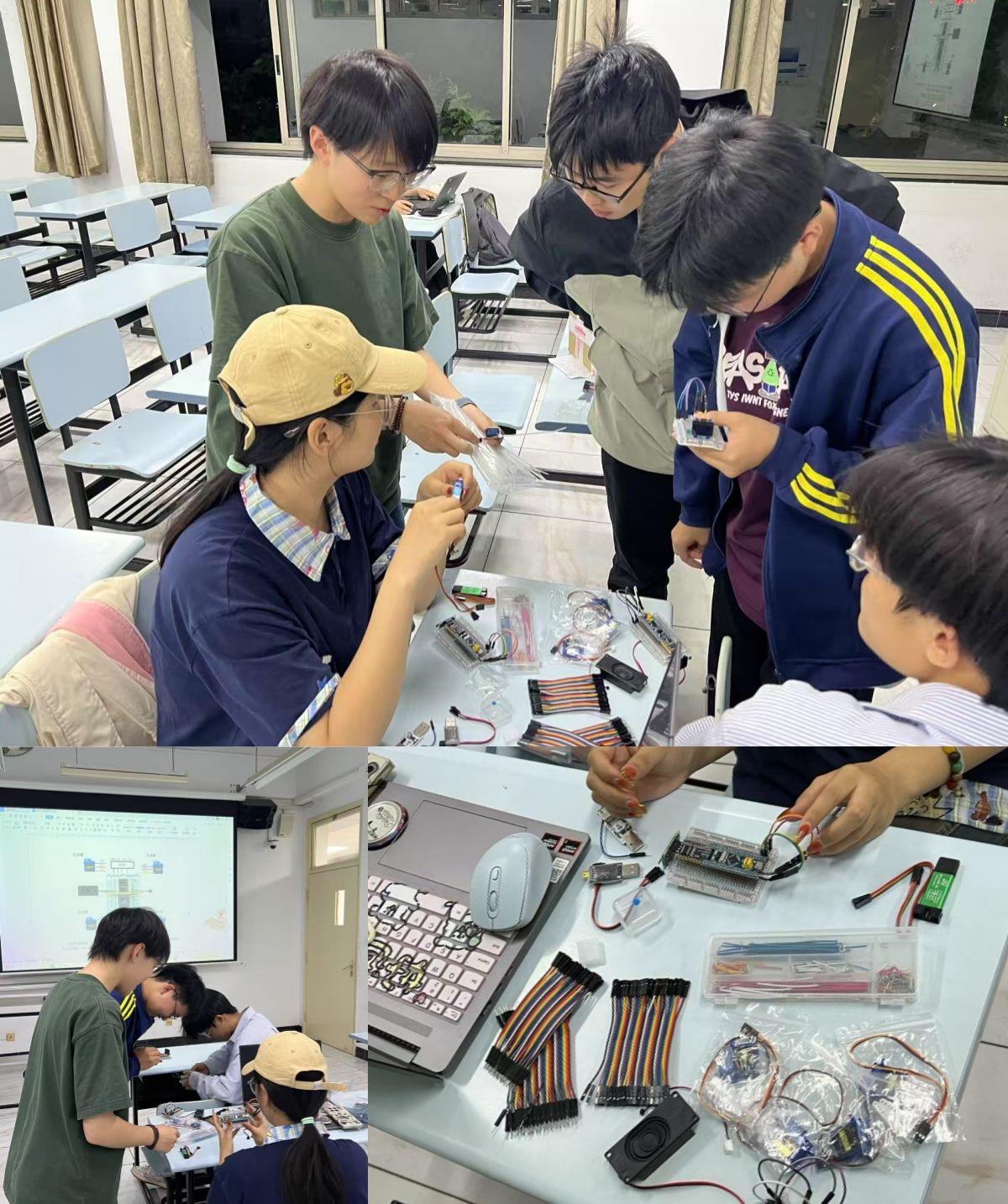 制作过程中,很多同学面对焊接不稳、代码出错、舵机死机等“小意外”时,一度想要放弃。但令人感动的是,现场处处可见互相帮助的身影:一起调试电路,手握电烙铁、额头冒汗;一起查资料、看手册、修改代码;一个小组调通了电机,立刻分享经验给周围的同学……