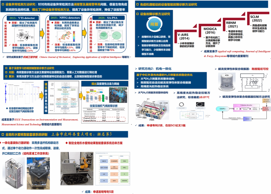 长期从事人工智能、复杂装备异常检测与故障诊断、农业机器人及高精密测量装备的研究工作,主要包括:液体火箭发动机涡轮泵叶片裂纹故障诊断技术研究、大型复杂装备小样本增量学习免疫智能诊断方法研究、大型海洋平台健康检测、全地形水蜜桃智能套袋系统研制、强化学习算法应用及大气N2O痕量气体测量装备研制等。先后主持国家自然科学基金青年基金项目1项,上海市科委科技创新行动计划项目1项,横向合作课题4项,现为中国振动工程学会故障诊断专业委员会理事。参与国家自然科学基金面上项目3项,横向合作课题10余项。以第一作者及通讯作者在《Applied Soft Computing》、《Engineering Applications of Artificial Intelligence》、《机械工程学报》等国内外重要期刊以第一作者及通讯作者发表论文30余篇,其中SCI、EI检索20余篇,获授权发明专利10项,参与编写《人工智能理论与实践》教材1部。