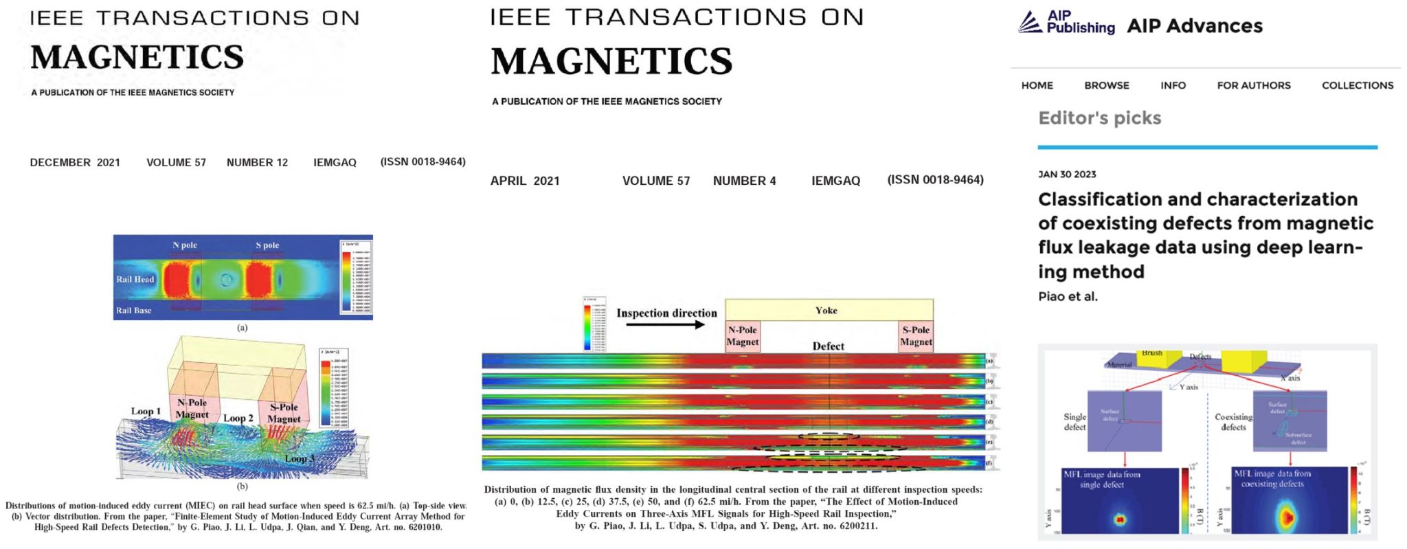 5、Piao G, Li J, Udpa L, et al. Finite-element study of motion-induced eddy current array method for high-speed rail defects detection[J]. IEEE Transactions on Magnetics, 2021, 57(12): 1-10 (封面论文).