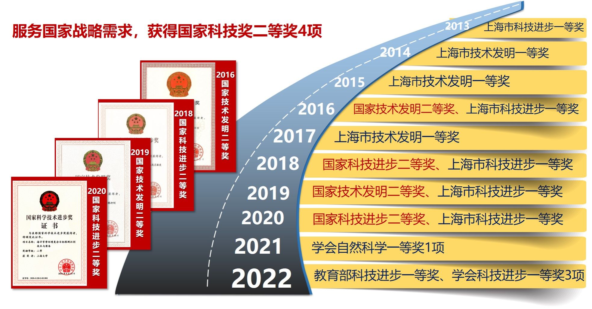 | 上海市科技进步奖 | 一等奖 | 窄带环境海洋弱目标探测识别技术与装备 | 彭艳等 | 2019 |